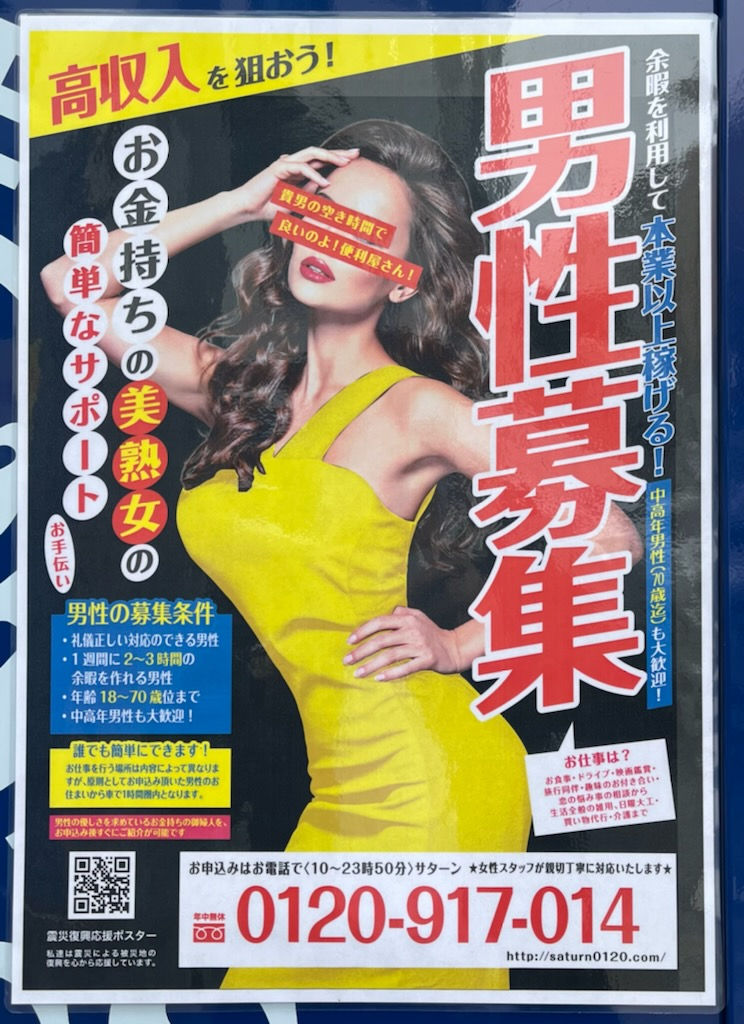 便利屋ケンちゃん。Ryusaku Chijiwa2022年8月30日読了時間: 1分2022年8月30日人に会うために出掛けた横浜で見かけた怪しい広告。誰でも簡単!高収入!!の甘い文句に釣られる御仁は居るのか。でも「あら、便利屋さん!」なんて言われたら「なにおぅ!」と言い返してしまいそう(笑)。性的なものをギリギリ連想させながら文言がないのは流石!